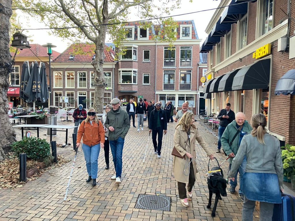 In de drukke binnenstad valt dat omzien niet mee voor wie slechtziend is of een andere beperking heeft. Alles is vlak. Er zijn geen stoepen meer. Fietsers, scooters, fatbikes kriskrassen tussen voetgangers door. Met een blinddoek voor ervaart een groep raadsleden heel even wat het is om te leven in een omgeving, waarin je afhankelijk bent van een stok, een hond en het besef bij de gemeente dat drie rondjes draaien op de Beestenmarkt ervoor zorgt dat je daar elk gevoel voor richting kwijt bent.